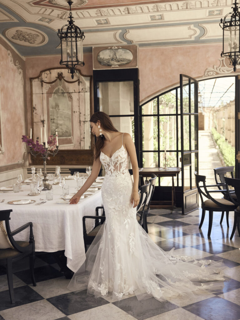 La dentelle se glisse dans toutes les silhouettes. Elle peut se faire discrète, opulente, délicate ou structurée, selon la coupe choisie.