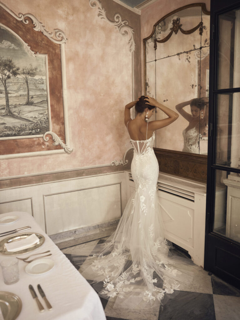 Les robes de mariée en dentelle reviennent au cœur des tendances en mêlant tradition et modernité. Le mélange des matières est à l’honneur, avec des jeux de transparence et des superpositions qui créent un effet tattoo délicat sur la peau. Les dos nus géométriques, les manches longues en dentelle fine, les découpes asymétriques ou les jupes fluides ornées d’empiècements stratégiques marquent les nouvelles collections. L’influence bohème persiste, avec des lignes épurées sublimées par des détails artisanaux. Des touches de couleur comme le nude ou le blush apportent une nuance contemporaine sans rompre avec l’élégance. Les créateurs osent aussi la réinvention des classiques : cols montants, capes amovibles ou combinaisons modernes en overlay dentelle. Plus que jamais, la robe s’adapte à la personnalité de la mariée, entre allure unique et raffinement assumé.