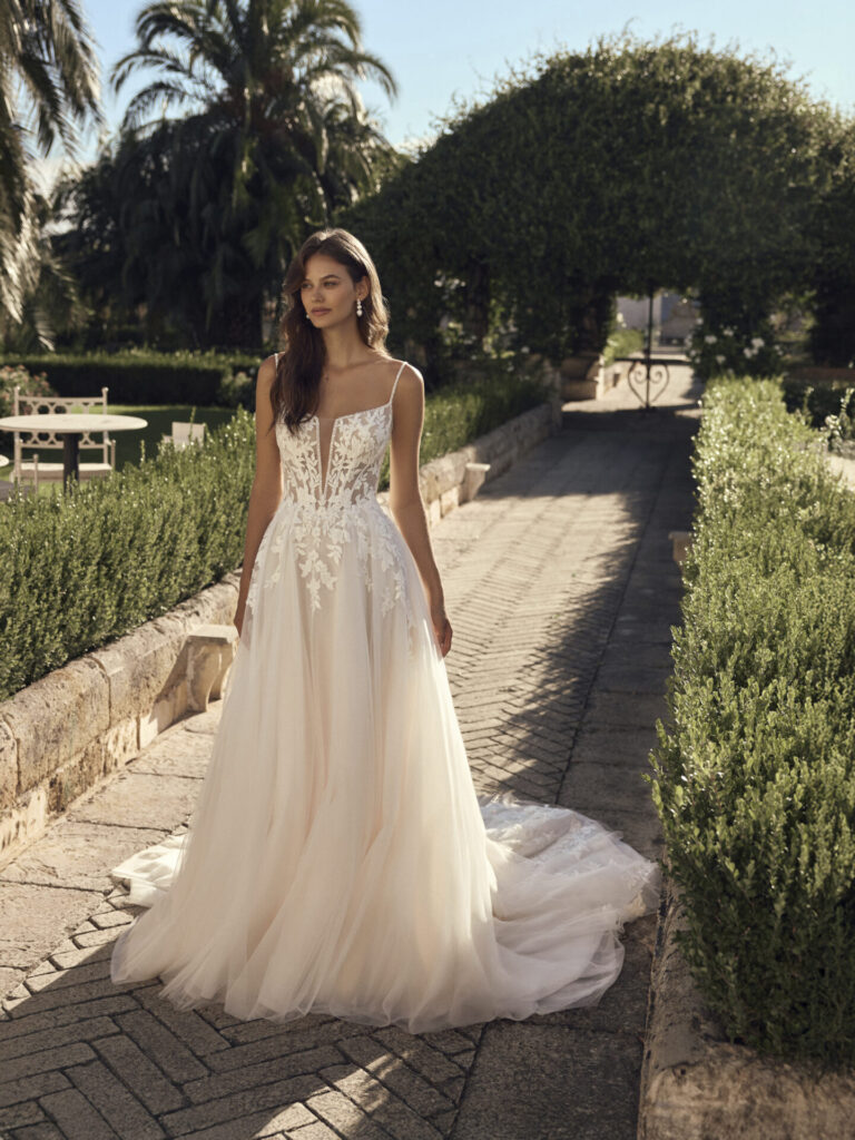 • Robe A-line fluide : dentelle légère sur tulle ou mousseline, idéale pour les mariages champêtres ou en plein air.