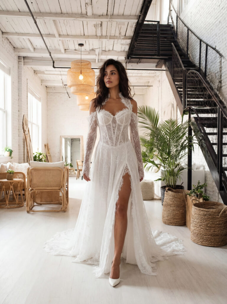 Robe de mariée fluide moderne en dentelle avec dos nu – Modèle Lior-A La robe de mariée Lior-A séduit par sa coupe princesse flu...