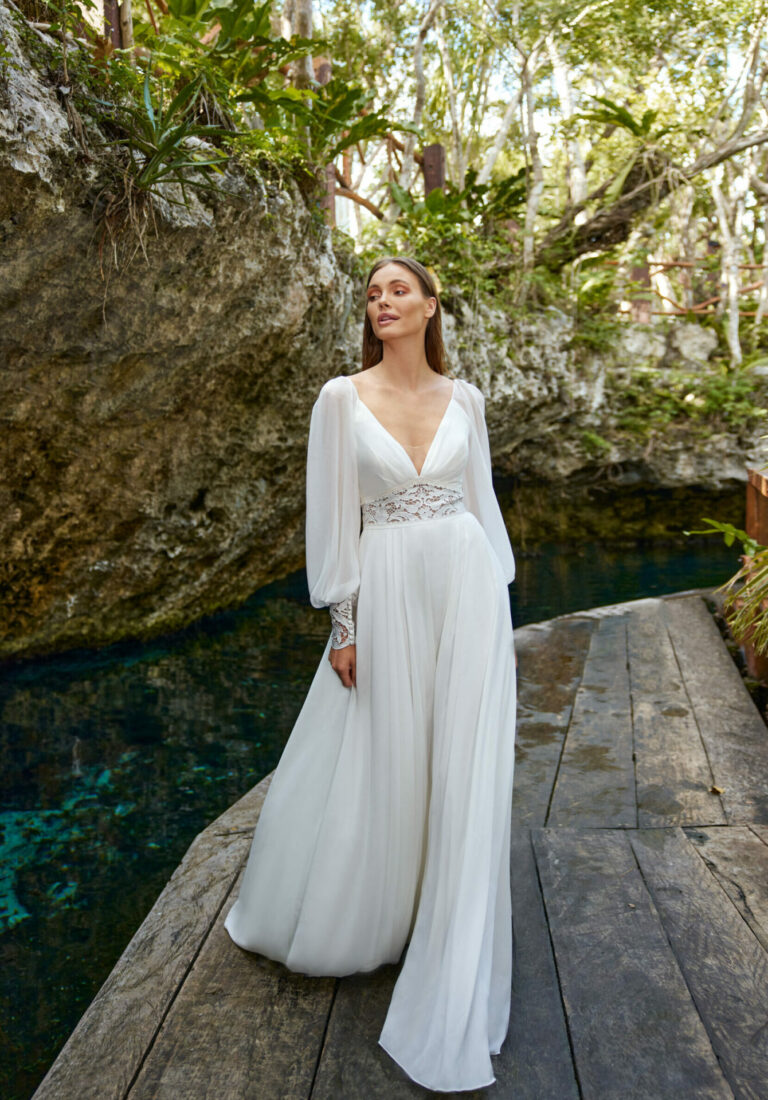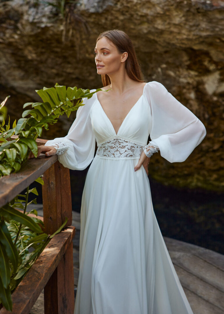 Libelle incarne un style romantique, fluide et raffiné. Chaque robe mêle détails couture (broderies, jeux de transparence, bretelles fines) à une modernité subtile, idéale pour les mariées en quête d’élégance naturelle.