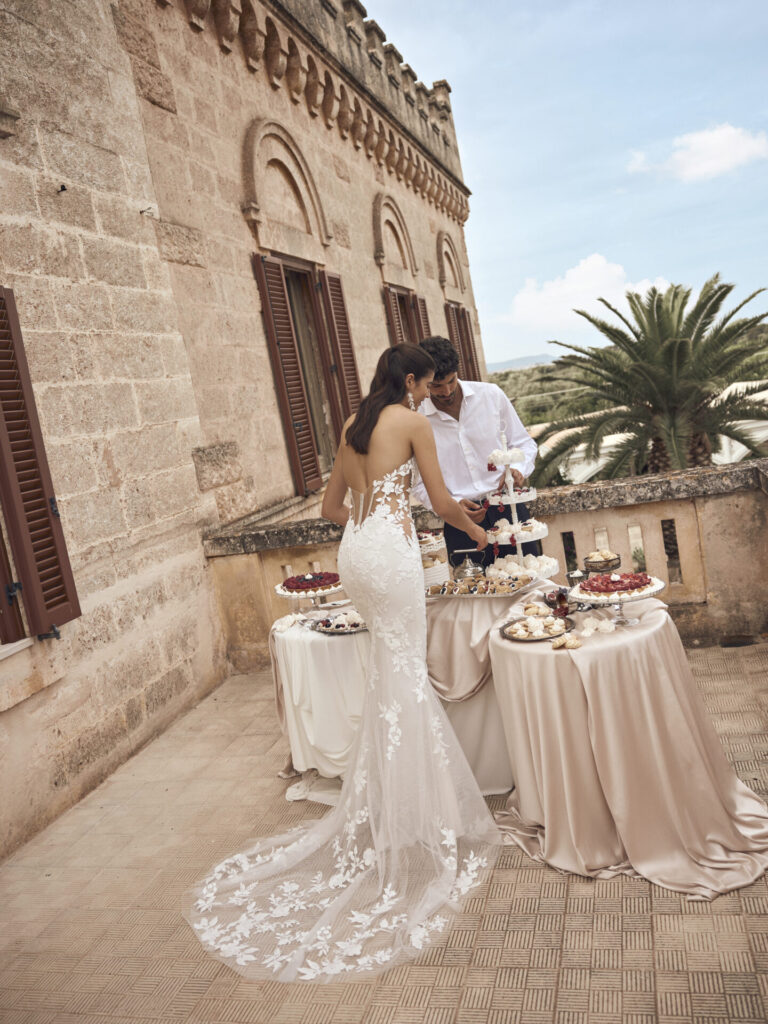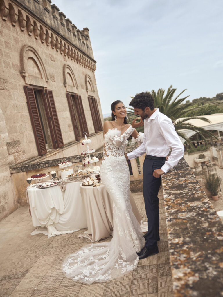 Au fil des saisons, nous avons expérimenté et sommes arrivés à la conclusion que chaque style de mariage peut accueillir une robe à manches longues, à condition de l’adapter intelligemment au contexte. Les mariages d’hiver appellent naturellement les manches longues. Dans ce cas, nous privilégions des tissus comme le mikado ou le crêpe doublé, offrant chaleur et maintien. Les manches peuvent être travaillées avec plusieurs épaisseurs, créant un cocon élégant et protecteur. Pour les cérémonies religieuses, notamment dans les lieux de culte, les manches longues apportent cette touche de solennité appropriée sans sacrifier le style. Nous jouons alors avec les transparences et les dentelles pour maintenir la dimension festive de la tenue. Les robes de mariée à manches longues sont particulièrement appréciées par les anciennes générations : elles leur rappellent des souvenirs mélancoliques ou heureux et cachent davantage le corps, ce qui est important dans un lieu saint. Les mariages en plein air, même en été, se prêtent parfaitement aux manches longues en tissu léger. Elles protègent du soleil tout en permettant à la peau de respirer. Un tulle de soie ou une dentelle de Chantilly créent un effet de légèreté parfait pour ces occasions. Vous réalisez ainsi le parfait combo : une robe de mariée élégante, qui apporte une touche d’originalité et qui vous éloigne des coups de soleil !