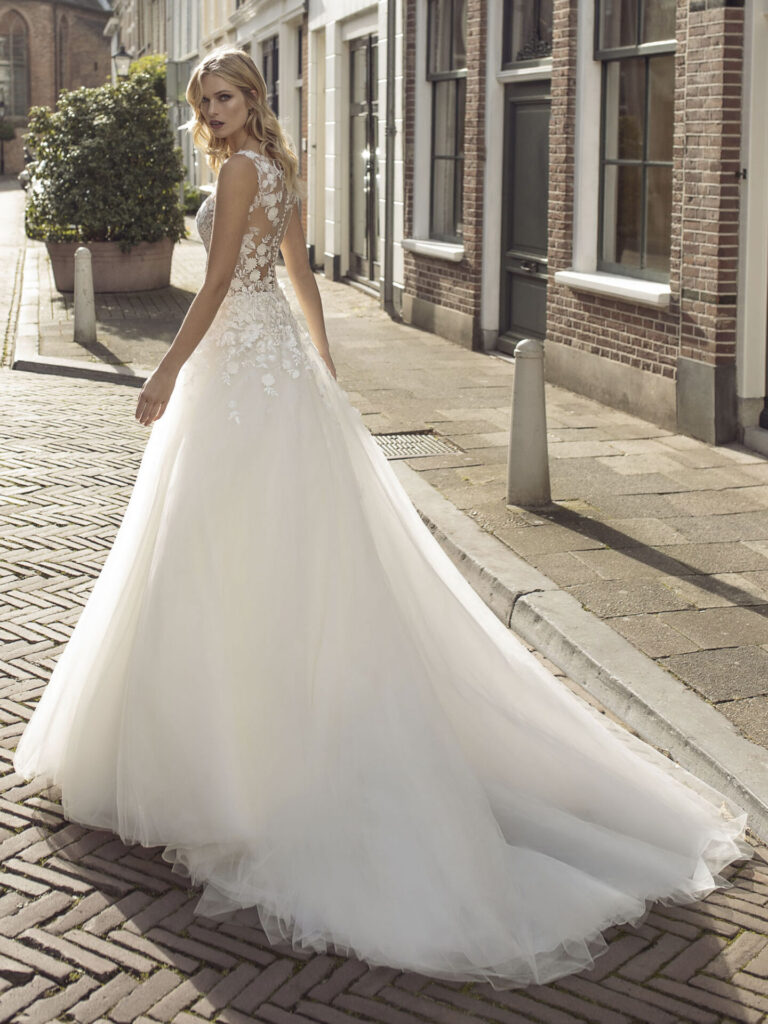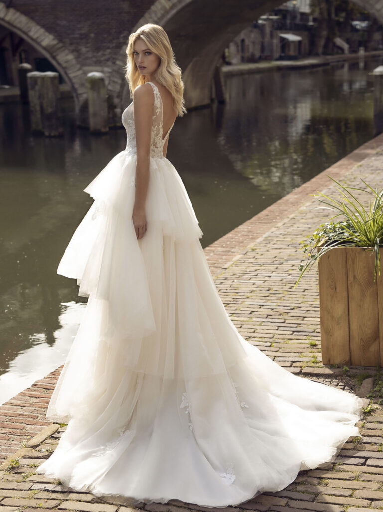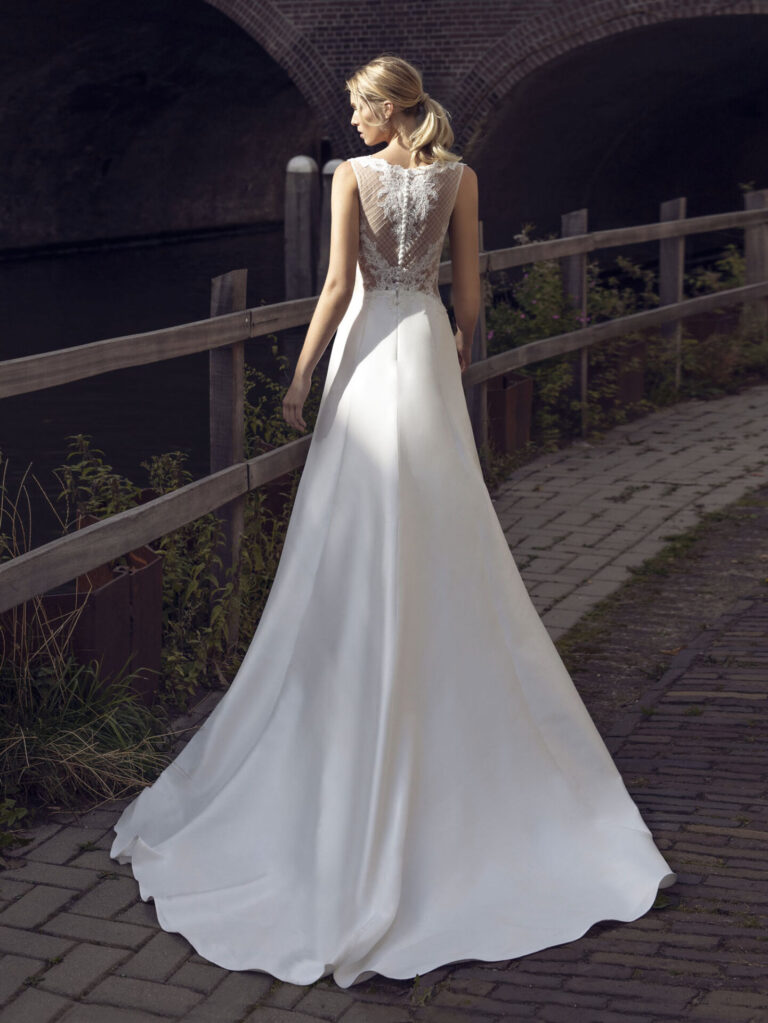 Robe de mariée trapèze en organza avec dos nu – Kelly Une robe moderne aux détails raffinés La robe de mariée Kelly allie une co...