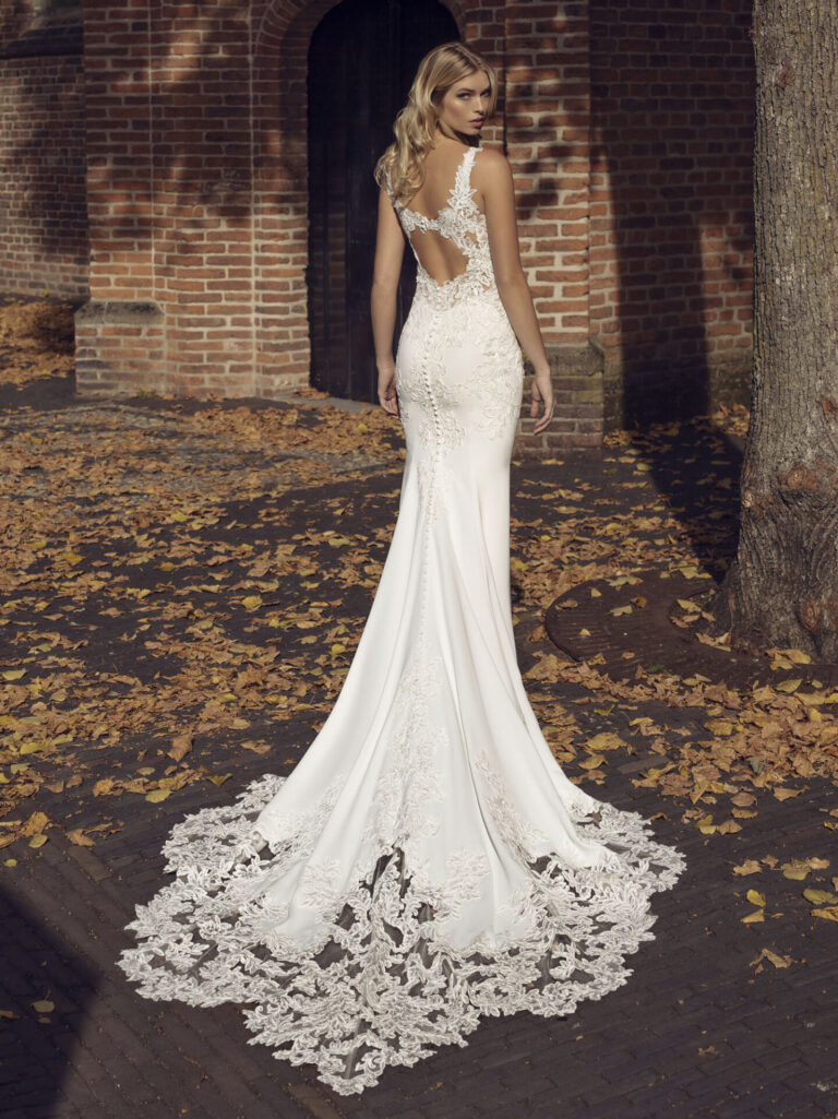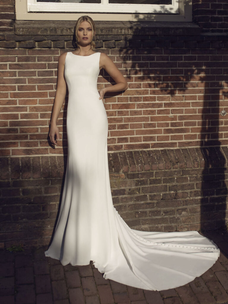 Une robe de mariée aux lignes épurées près du corps. Grâce à sa coupe, cette création sublimera la prestance de la femme forte q...