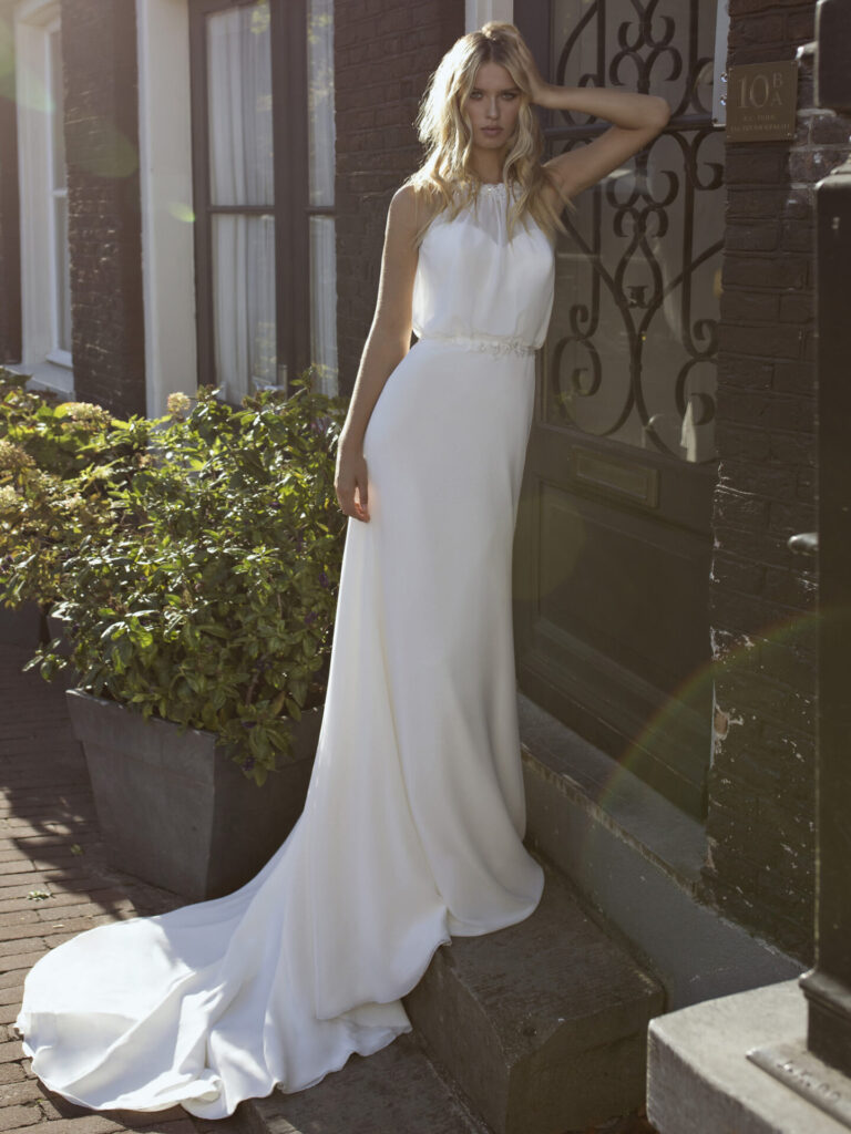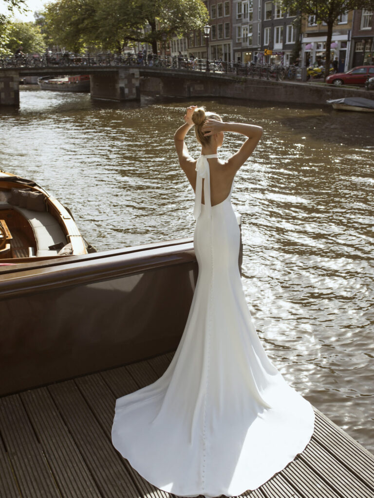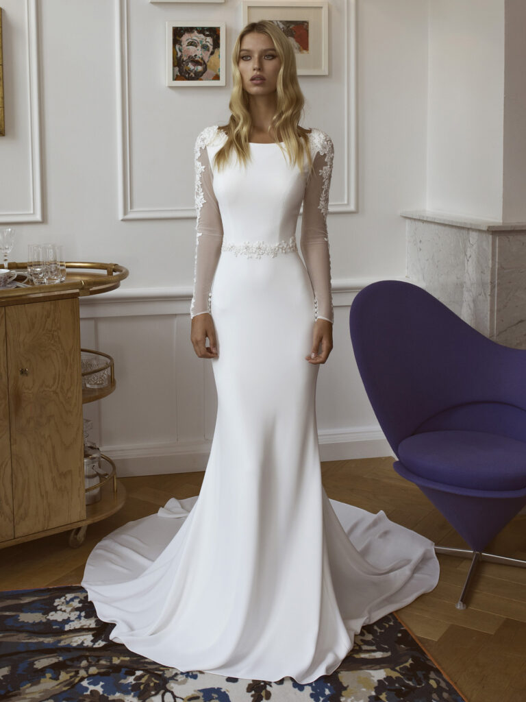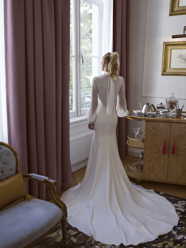 Une très jolie création tout en minimalisme et douceur. Une robe de mariée sirène, en crêpe et mousseline soyeuse, au décolleté...
