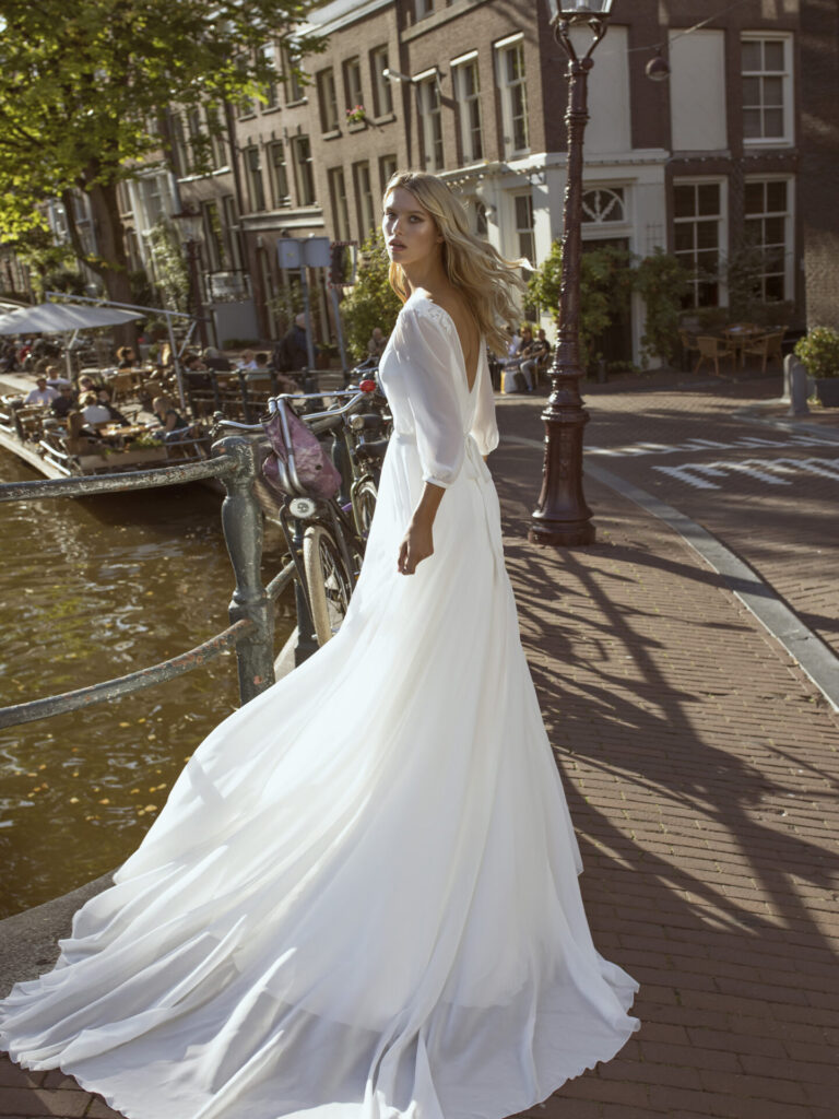 Une très jolie création tout en minimalisme et douceur. Une robe de mariée fluide, en dentelle et mousseline soyeuse, au décolle...