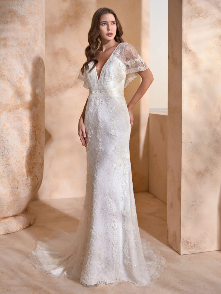 Une robe de mariée sophistiquée et romantique pour mettre en valeur vos formes. Le décolleté v en dentelle et motifs floraux est...