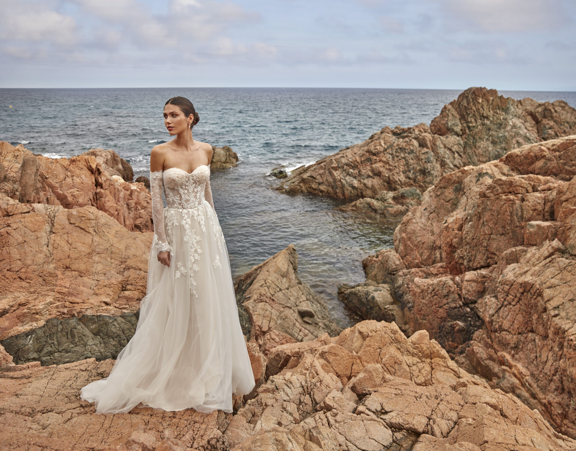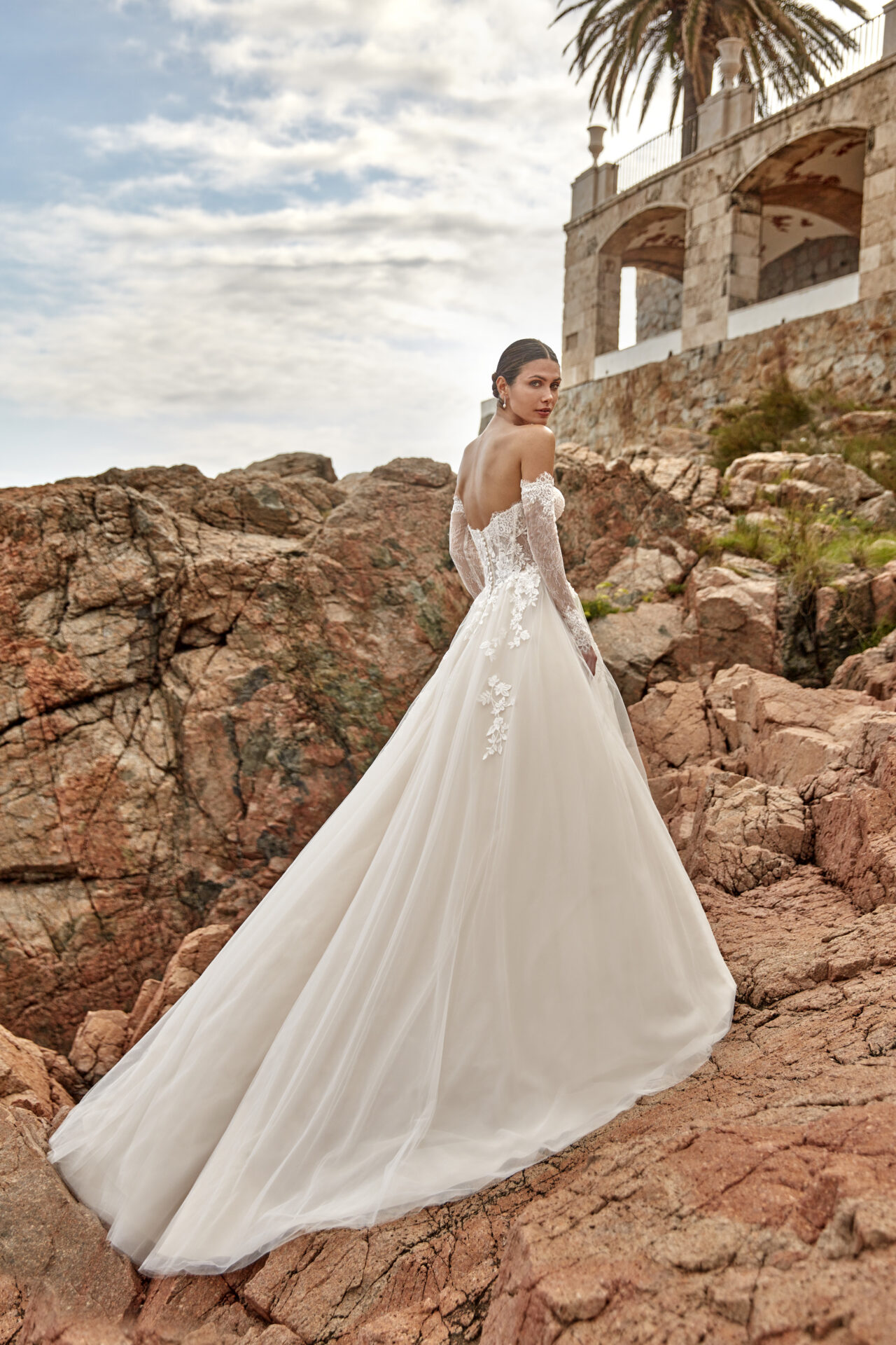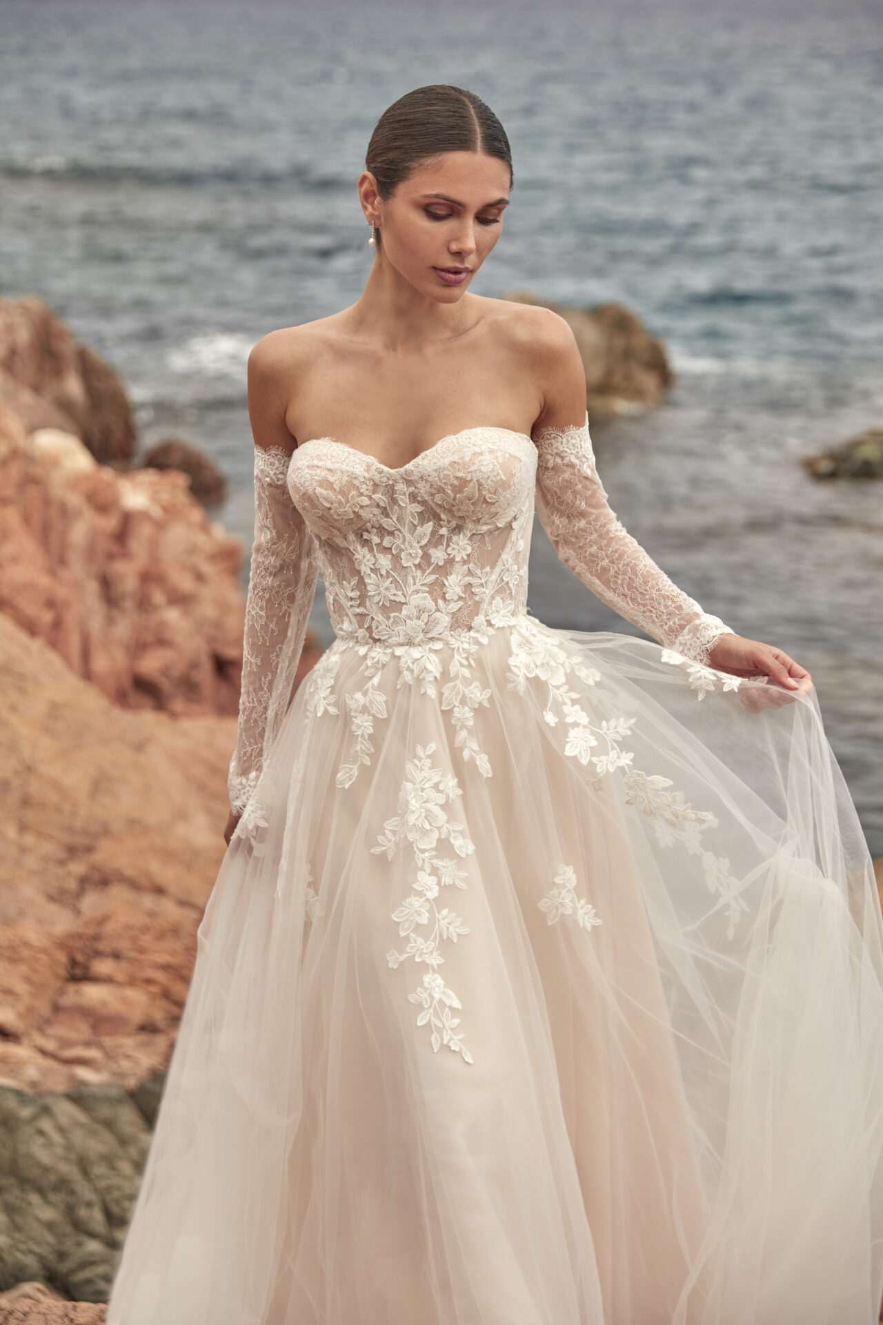 La robe Cassie est une très belle robe de mariée fluide en dentelle et tulle avec un decollete plongeant et son bustier qui mettra en valeur vos jolies épaules. Le décolleté de cette belle robe de mariée séduira tous vos invites. Les manches longues amovibles en fines dentelles vous permettent de porter la robe avec 2 versions différentes.Sa jolie traîne va vous allonger la silhouette.