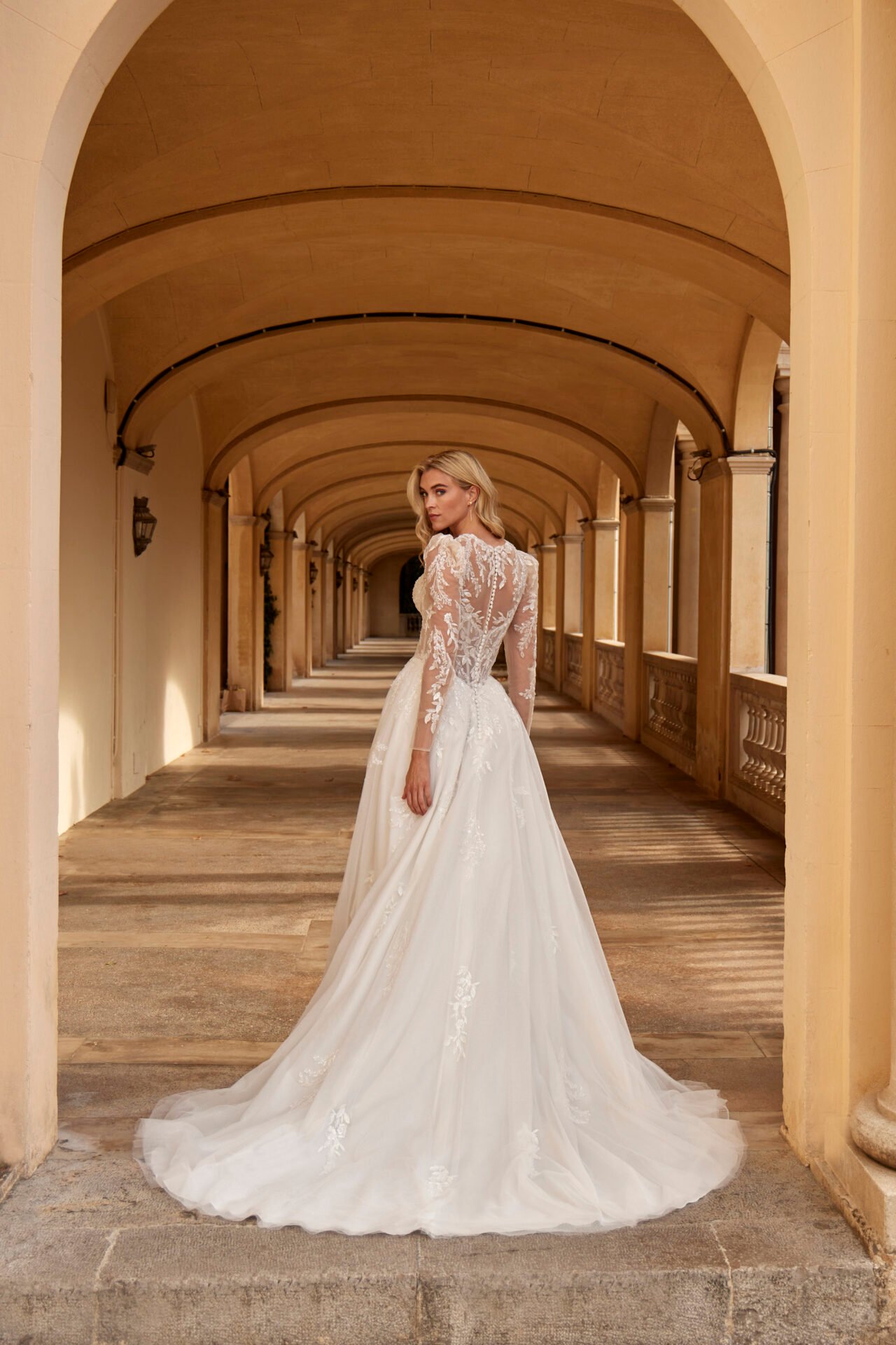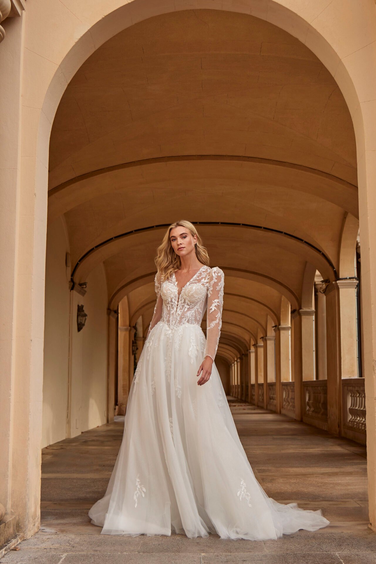 La robe Chloé de la collection AMELIE 2027 est une très belle robe de mariée trapèze en tulle avec un top a bretelles et des manches longues raffinées et un décolleté plongeant, son bustier tout en dentelle, sequins et perles de cette belle robe de mariée séduira tous vos invites et .mettra en valeur vos jolies formes. . Sa jupe fluide et vaporeuse est une robe spectaculaire mais très pratique avec une jolie traîne.
