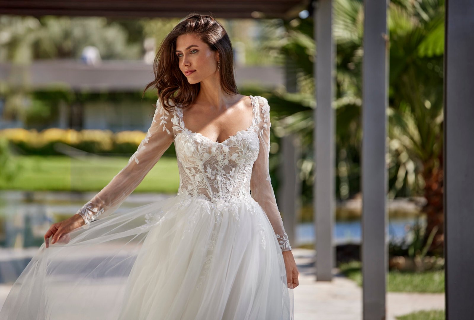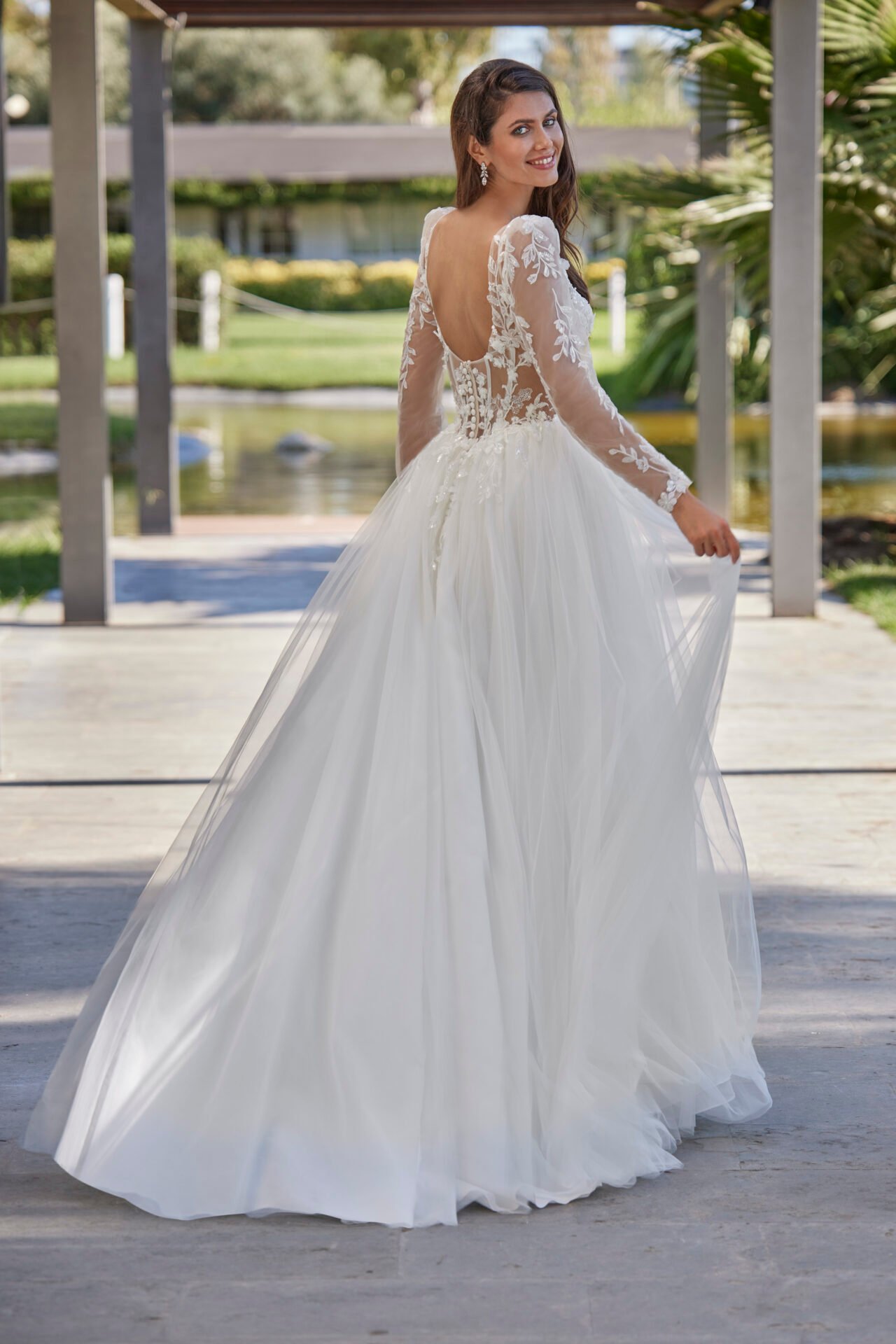 La robe Clelie de la collection AMELIE 2027 est une très belle robe de mariée trapèze en tulle avec un top a bretelles et des manches longues raffinées et un décolleté plongeant, son bustier tout en dentelle, sequins et perles de cette belle robe de mariée séduira tous vos invites et .mettra en valeur vos jolies formes. . Sa jupe fluide et vaporeuse est une robe spectaculaire mais très pratique avec une jolie traîne.