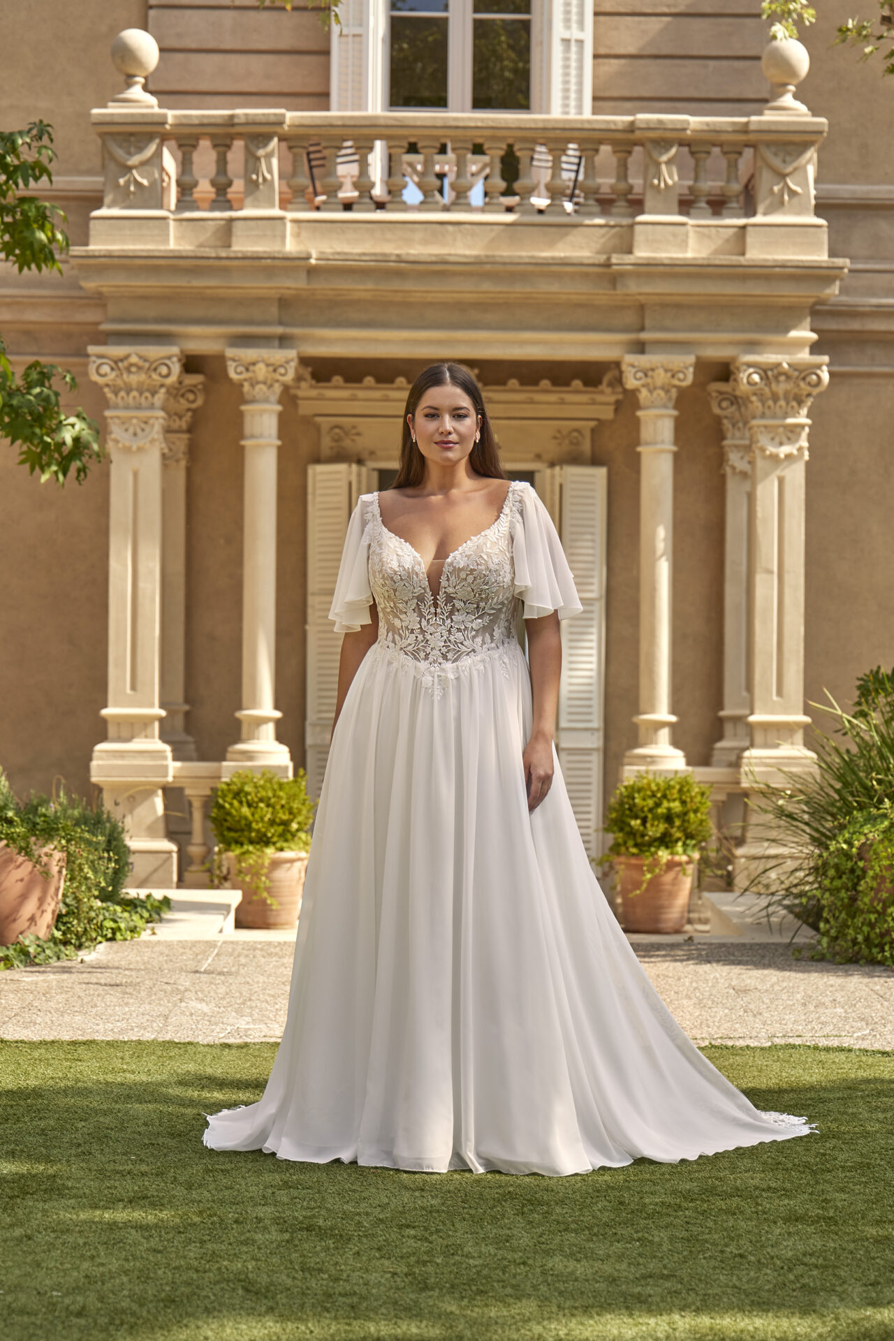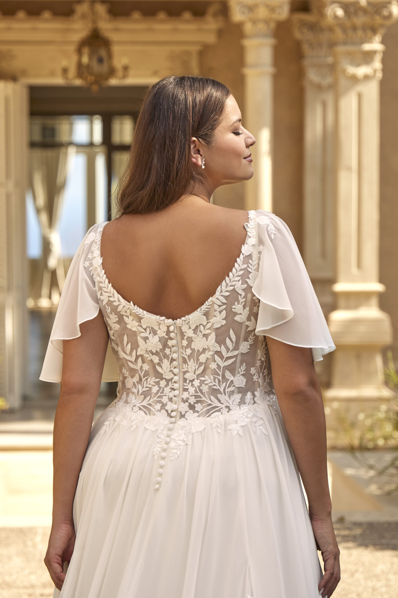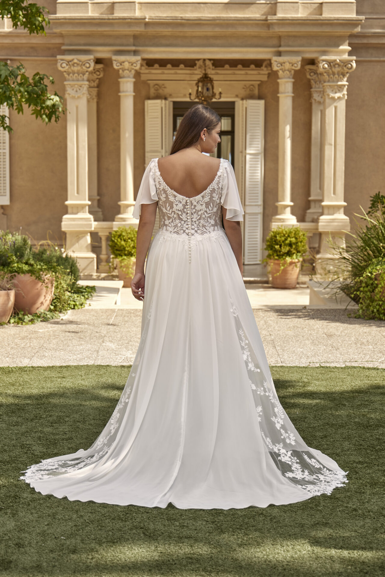 La robe de mariée Colombe de la collection Bella 2027, donnez vie a votre rêve avec cette robe Bella. Une magnifique robe de mariée fluideen mousseline avec de jolies manches fluides et vaporeuses en mousseline légèrement en transparence. Le bustier apparait avec des baleines apparentes qui vont marquer et affiner votre taille. Cette robe fluide en mousseline ajoute un éclat sophistiqué à ce look de mariée. Un très beau dos nu carré ajoute un détail inattendu qui vous fera briller de mille feux lors de votre passage dans l’allée. La robe de mariée Colombe se termine par une jupe légère et fluide en mousseline et une traîne en dentelle très spectaculaire.