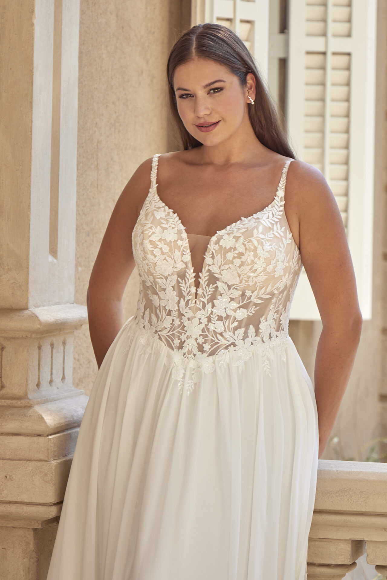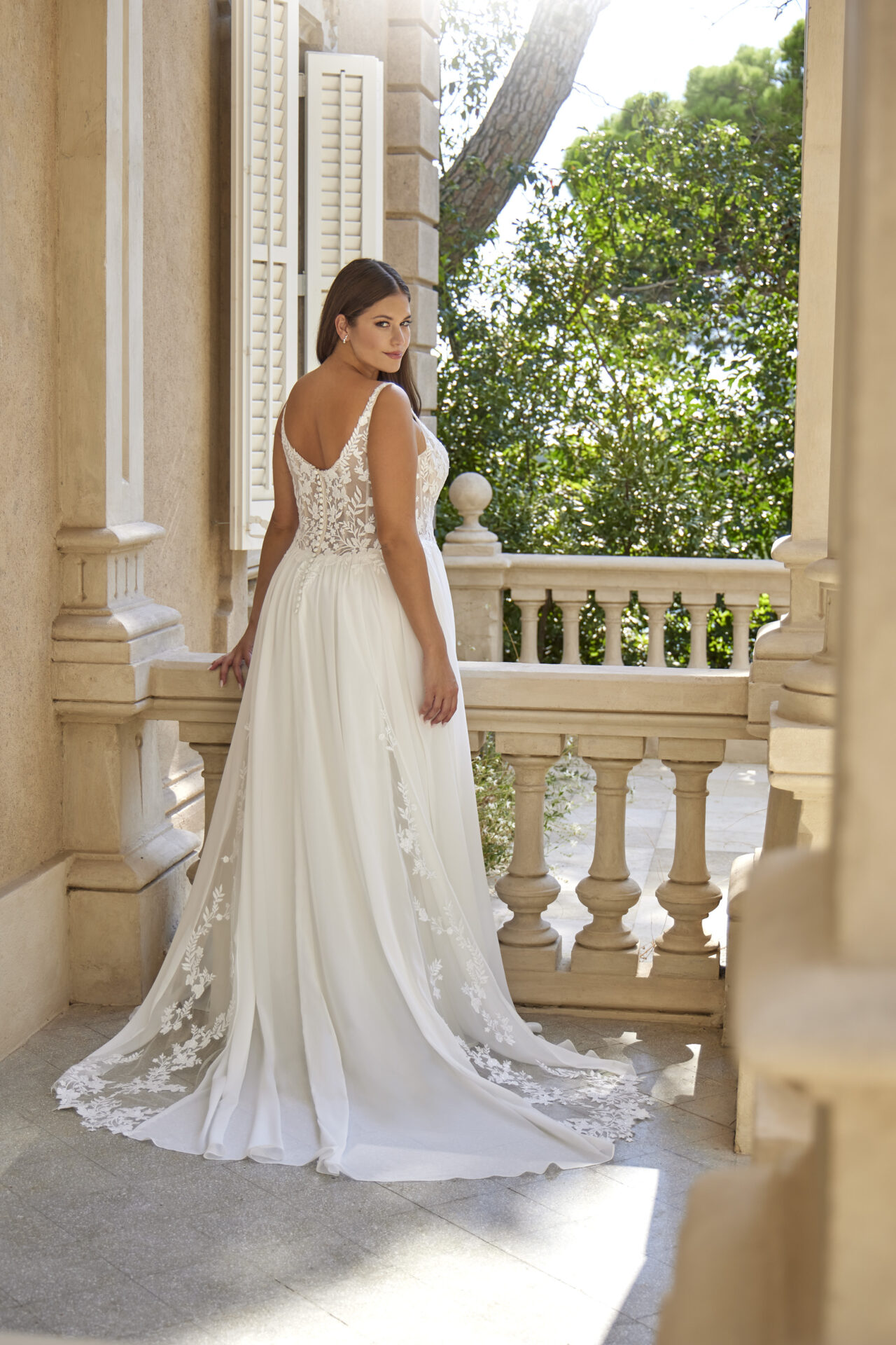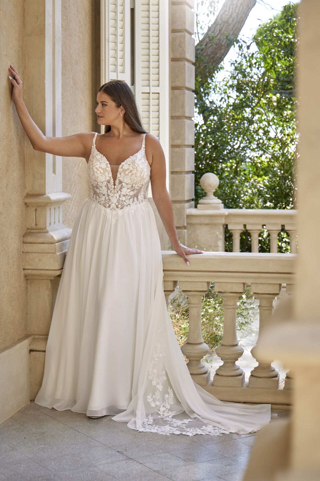 La robe de mariée Colombe de la collection Bella 2027, donnez vie a votre rêve avec cette robe Bella. Une magnifique robe de mariée fluideen mousseline avec de jolies manches fluides et vaporeuses en mousseline légèrement en transparence. Le bustier apparait avec des baleines apparentes qui vont marquer et affiner votre taille. Cette robe fluide en mousseline ajoute un éclat sophistiqué à ce look de mariée. Un très beau dos nu carré ajoute un détail inattendu qui vous fera briller de mille feux lors de votre passage dans l’allée. La robe de mariée Colombe se termine par une jupe légère et fluide en mousseline et une traîne en dentelle très spectaculaire.