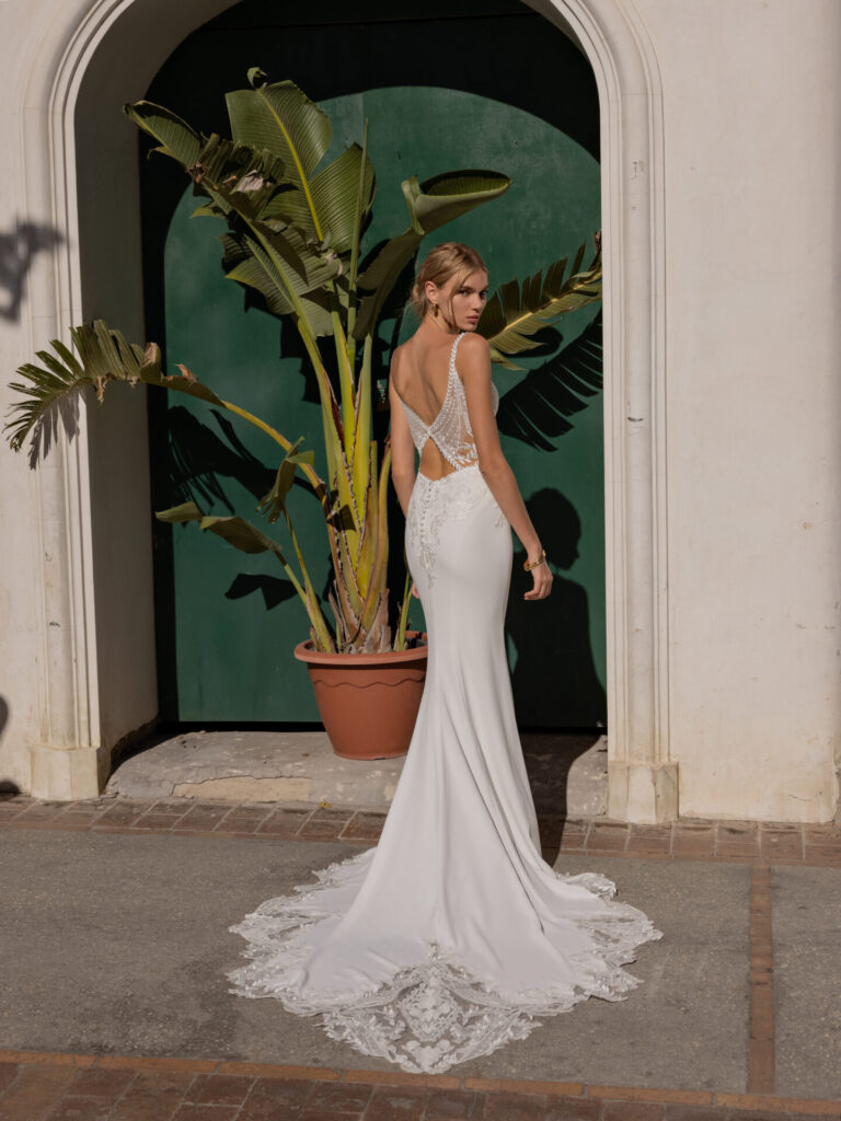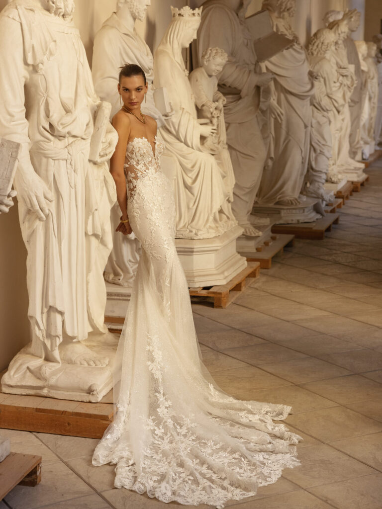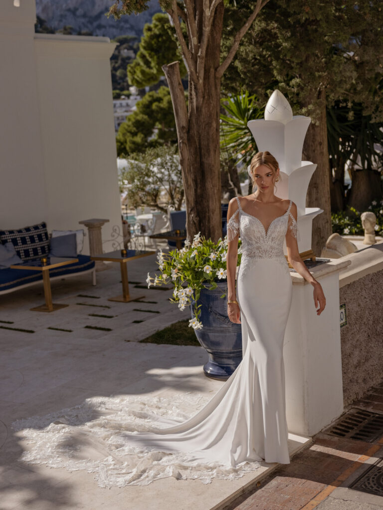 Une robe de mariée avec un fond de jupe près du corps et une épaisseur de tulle fluide, souple et pailleté, rebrodée de quelques dentelles qui redescendent sur les hanches. Pas trop de volume sur les hanches, idéale pour les jeunes femmes qui souhaitent une silhouette avant tout féminine façon sirène, mais aussi un effet vaporeux et fluide.