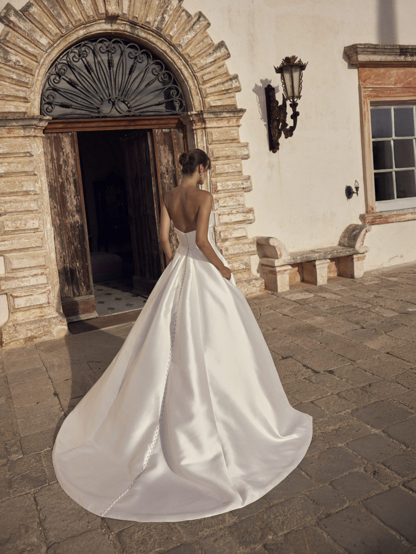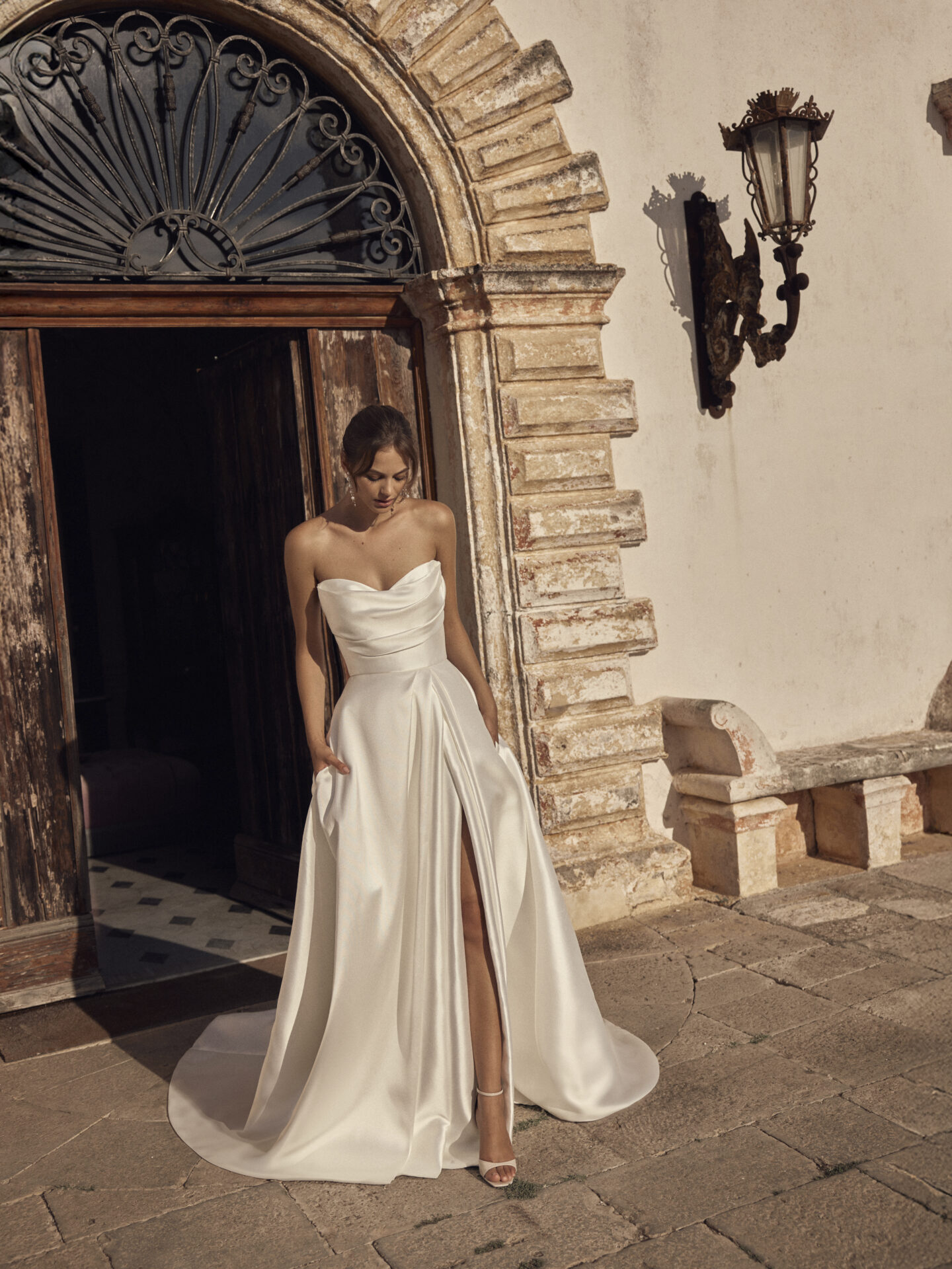La robe de mariée Marcella de la collection Modeca 2027 est un classique intemporel pour les mariées romantiques, élégantes mais modernes. Robe de mariée bustier pour accentuer vos jolies épaules présente un superbe corsage drapé, la jupe est en forme A line avec un joli volume mais avec une belle fente et des plis dans le drape en asymétrie sur le coté. Cette magnifique robe de mariée Marcella a des poches qui ajoutent une touche élégante à ce look très parisien. Les boutons sont sur toute la longueur de la traîne.