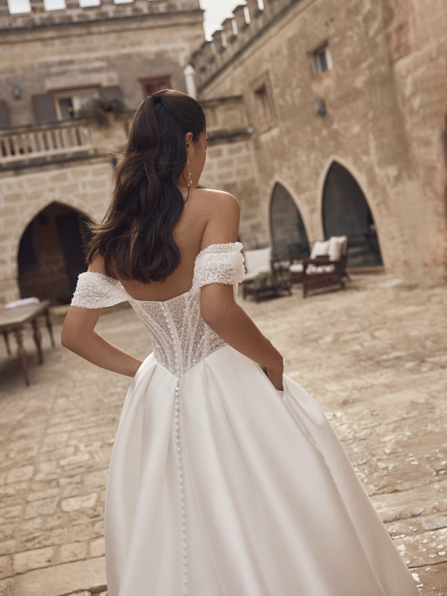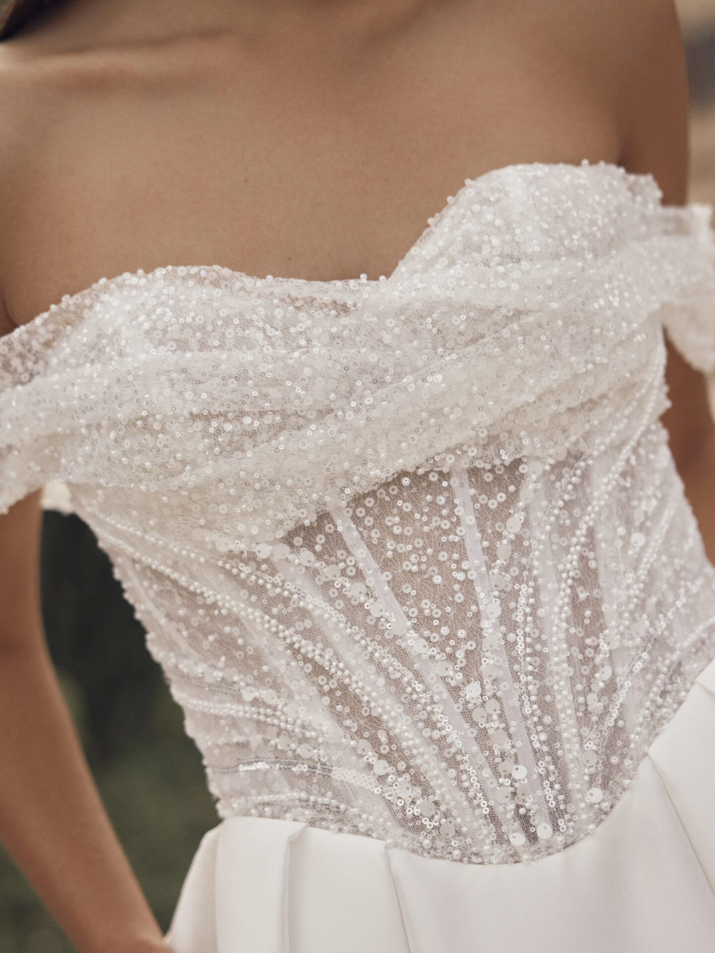 La robe de mariée Melindra de la collection Modeca 2027 est une superbe robe de bal avec un magnifique volume en mikado qui respire l’élégance intemporelle avec une touche de modernité. Le corset est structuré, baleiné, très ajusté façon corset en pointe présente un décolleté creusé accentué par des baleines tout en perles fines, en transparence, très spectaculaire et des bretelles façon encolure bateau. Cette robe de mariée est un Best de notre collection elle va époustoufler par son originalité et son effet spectaculaire.