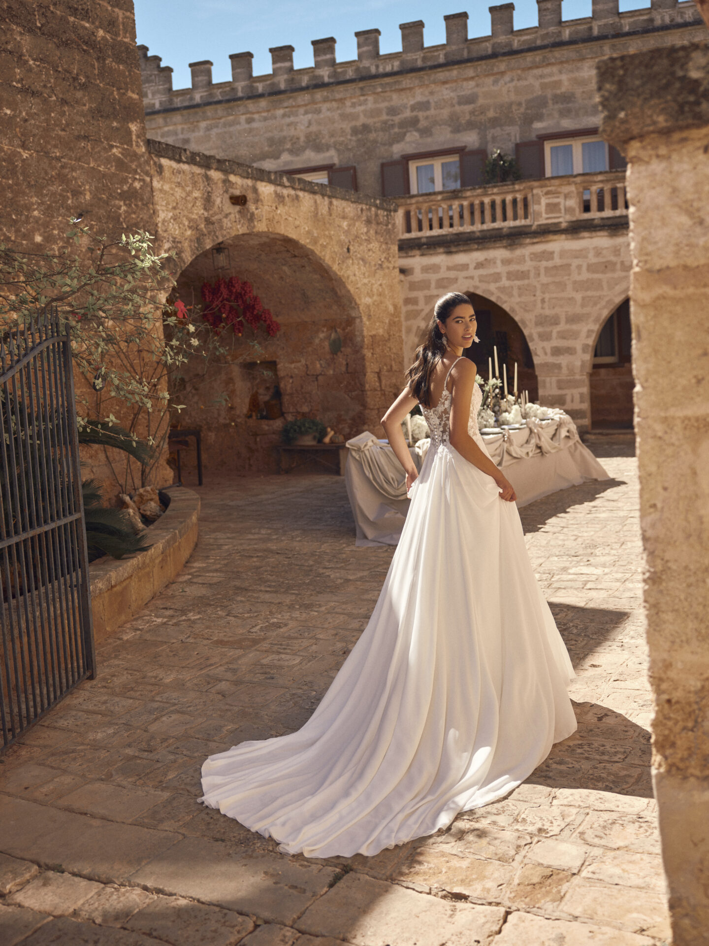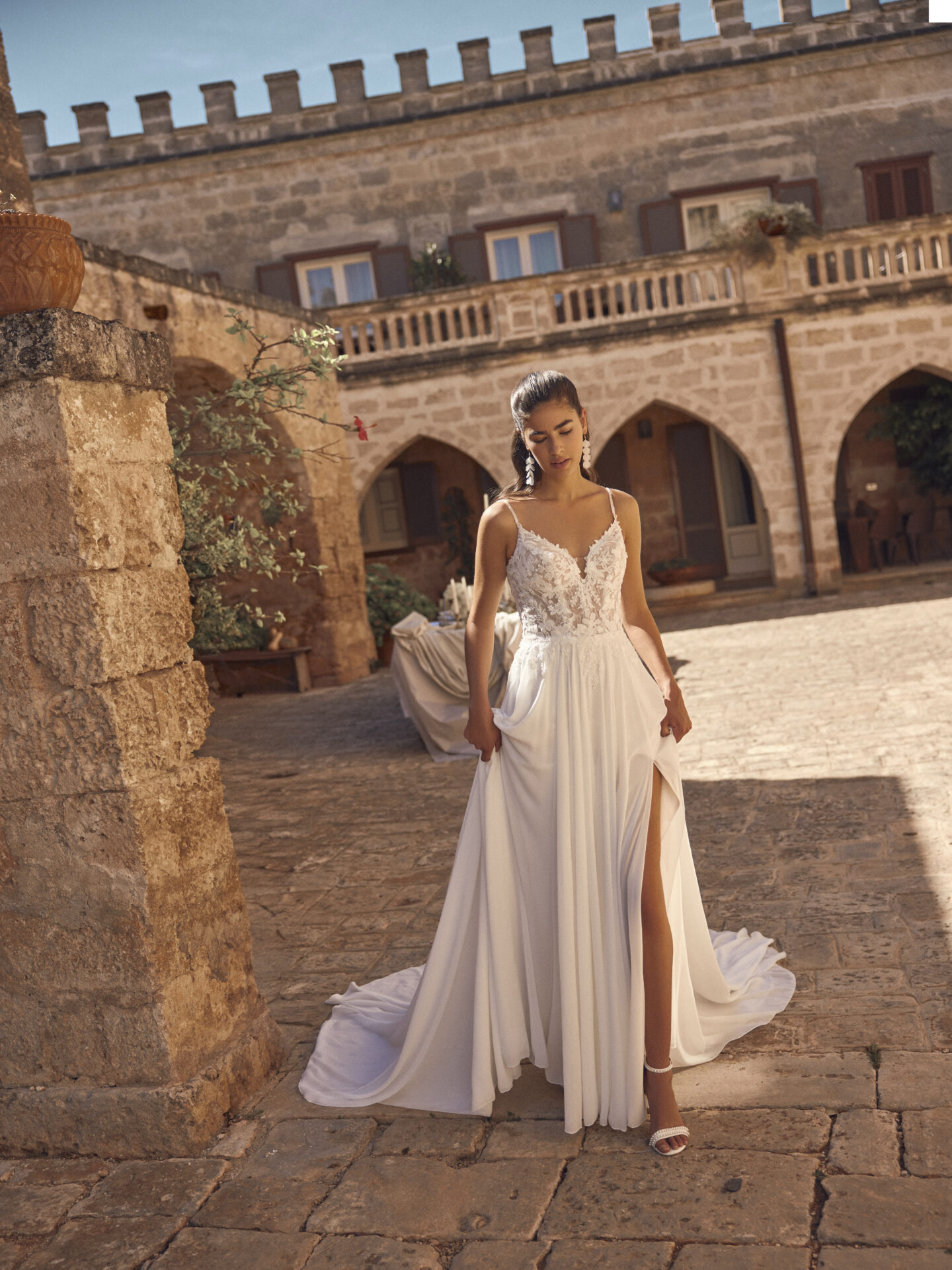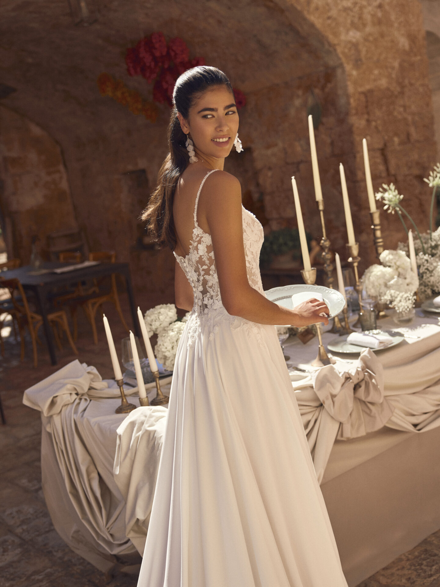 La robe de mariée Miriam de la collection Modeca 2027 vous fera brillez toute la nuit, cette étincelante robe de mariée Miriam fluide en dentelle et élégante. Le corsage exquis est orné de dentelle délicate et de paillettes scintillantes qui attirent l’attention sur l’élégant décolleté en V. Les bretelles fines gracieuses ajoutent une touche d’élégance. La jupe est sublime tout en fluidité, confort et légèreté. Cette robe de mariée Miriam possède également une belle fente qui donne le cote glamour et féminin et permet d’allonger la silhouette en gardant un cote couture.