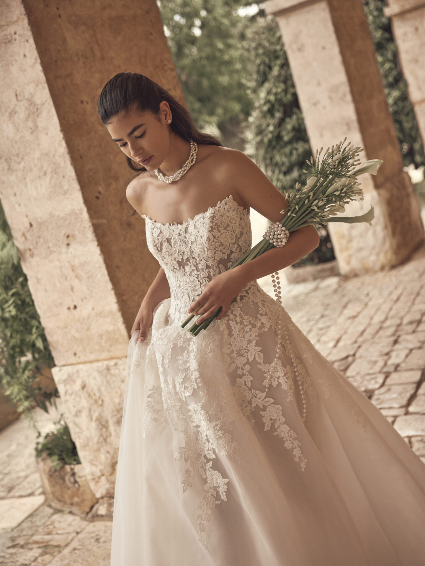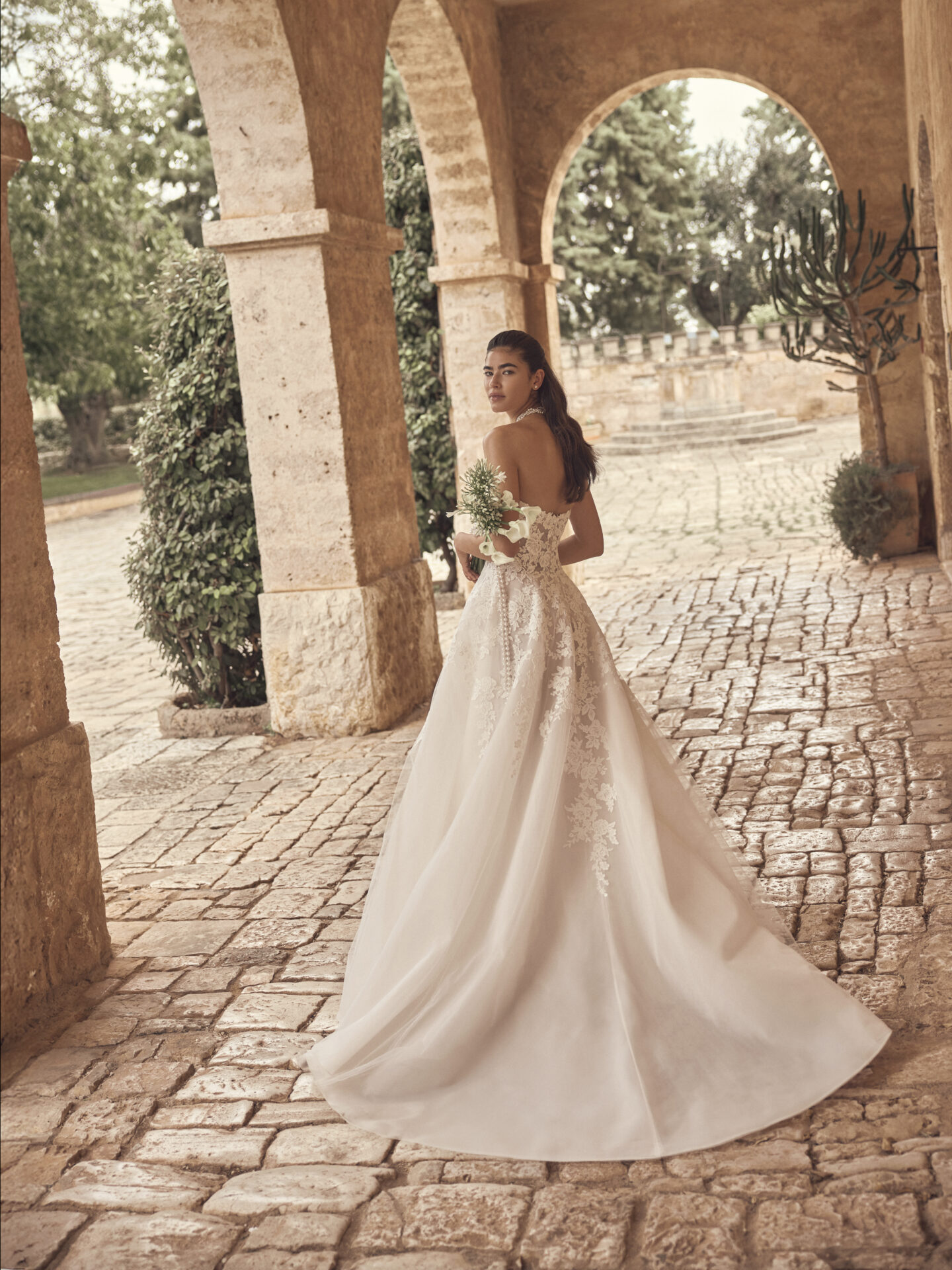 La robe de mariée Morwen de la collection Modeca 2027 incarne la romance dans ce classique A-line design Morwen. Le corsage présente un bustier tout en dentelle très sophistiqué et il est orné de dentelle délicate dans un motif floral et des dentelles travaillées avec précisions et raffinement, donnant à cette robe une touche séduisante. Des paillettes mènent à un magnifique dos et en transparence avec un zip invisible. La jupe en organza est étincelante avec ses applications de dentelles vous fera briller.