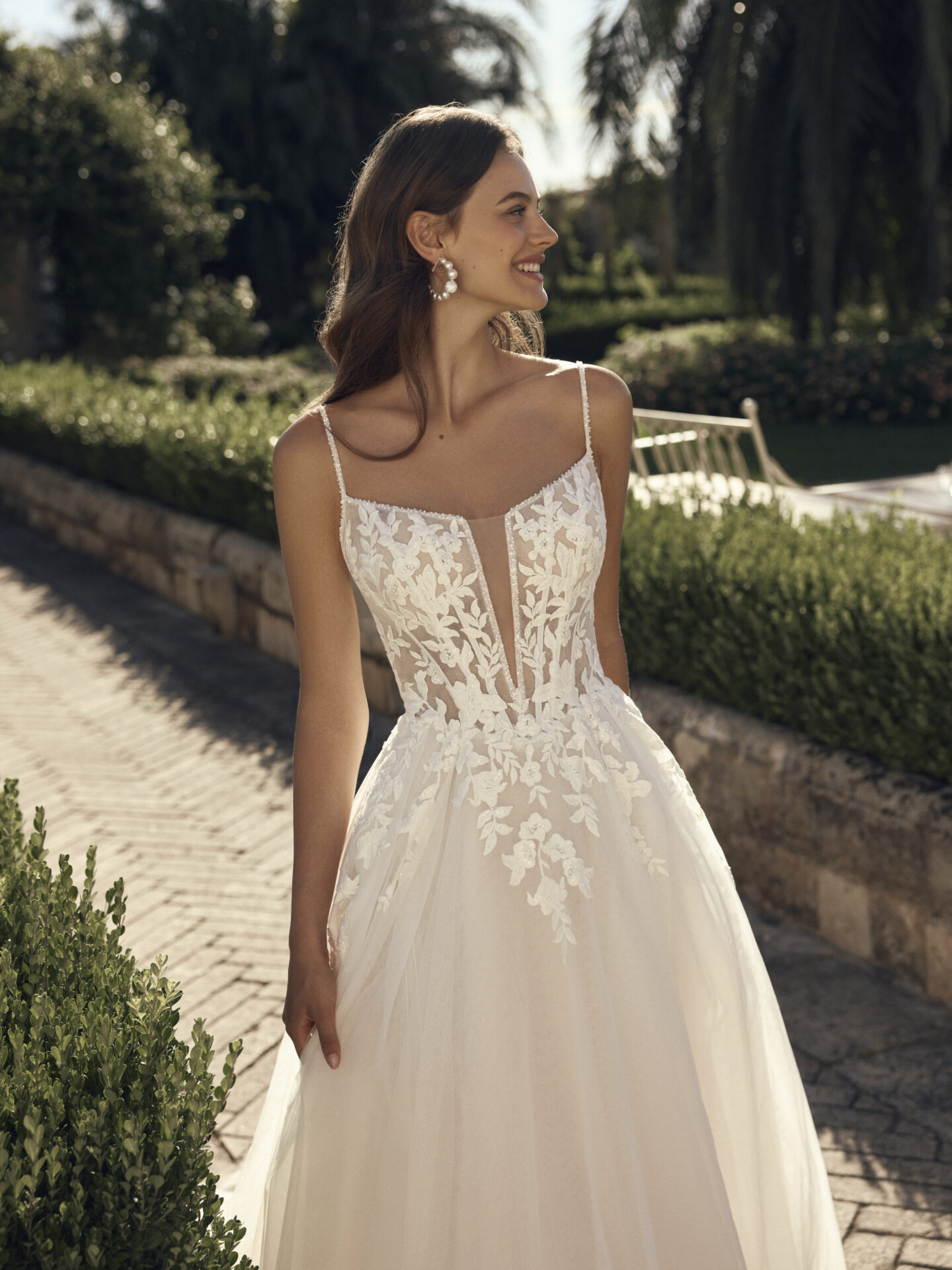 La robe de mariée Moyra de la collection Modeca 2027 est une magnifique robe de mariée fluide avec de jolies bretelles fines rebrodées de dentelles et fleurs légèrement en transparence avec des baleines apparentes qui vont marquer et affiner votre taille. Cette robe fluide en mousseline avec un decolleté profond et une taille bien marquée ajoute un éclat sophistiqué à ce look de mariée. Un très beau dos nu ajoute un détail inattendu qui vous fera briller de mille feux lors de votre passage dans l’allée. La robe de mariée Moyra est vaporeuse grace a sa jupe légère, fluide et une traîne en dentelle très spectaculaire.
